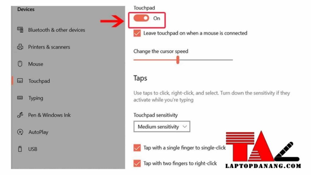 • Bước 3 : chọn Touchpad => nhìn bên phải và chọn nút On ( Off )