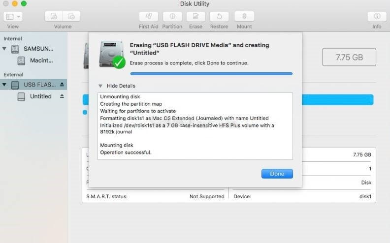 Nhấp vào “Xóa” và đợi hộp thoại “Xong” kết thúc. Trước khi rút đầu nối USB, nhấp chuột phải vào biểu tượng USB trong cửa sổ Finder và chọn Eject.