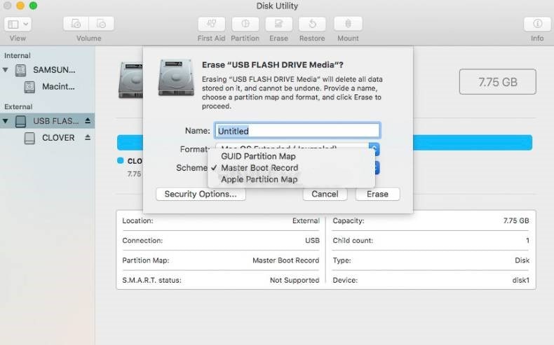 - Scheme là một định dạng bảng phân vùng với các tùy chọn cho Bản đồ phân vùng GUID, Bản ghi khởi động chính hoặc Bản đồ phân vùng Apple. Thường thì GUID được chọn.